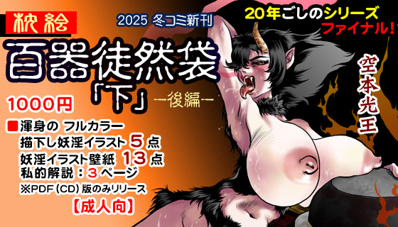 〜枕絵百器シリーズもこれでコンプリート!〜 イラスト少なめのかわりに 「枕絵百器徒然袋」の妖怪壁紙13枚も収録★ ご来場の皆様ありがとうございました! |